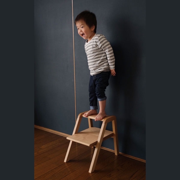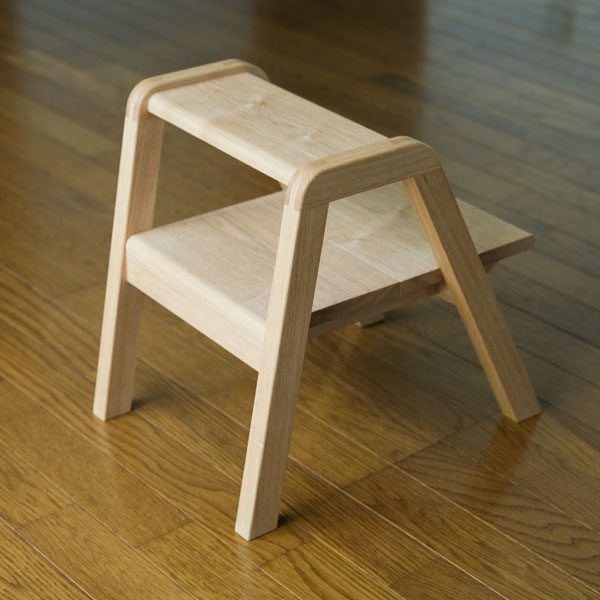 小さい椅子は大人も子供も使えるよう設計しています。踏み台椅子には上質なタモ無垢材を使い、大人の方が踏み台として使えるよう十分な強度を持たせました。キッチンで、あるいはちょっと高いところに用があるときに重宝すると思います。