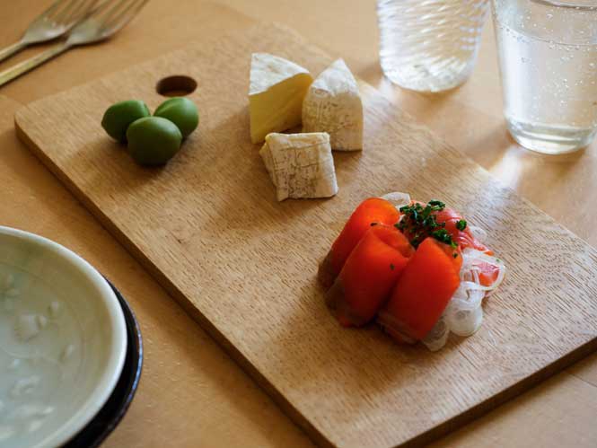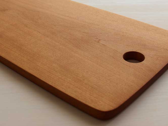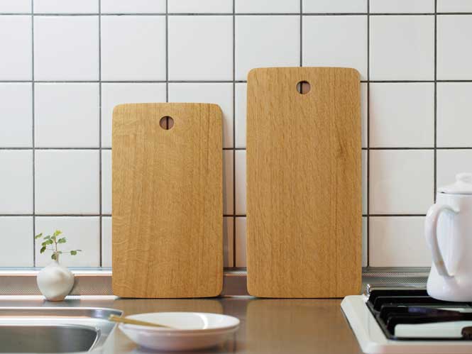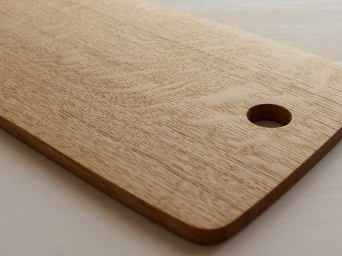 木のカッティングボードには丸い穴を開けました。穴はカッティングボードのアイコンだと思っています。ただの板だとカッティングボードには見えず、不思議なことに穴が端の方に開くと「あ、カッティングボードだ!」って思います。でも、正円だと何かがしっくりきません。ので楕円にしてあります。よーく見ないとわかりません。